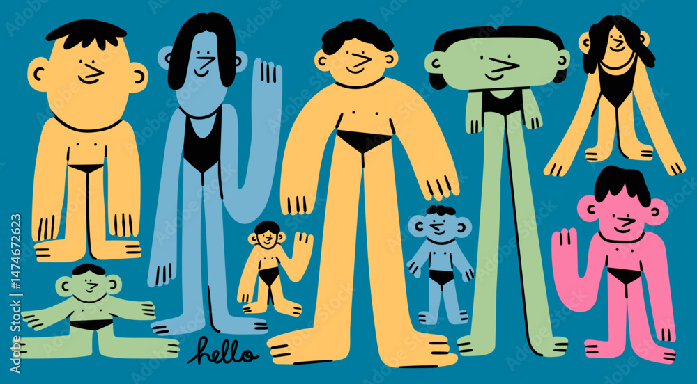Various abstract People. Cute big, tall, small, short people. Different shapes of bodies, legs, heads. Cartoon style characters. Hand drawn trendy Vector illustration. Isolated design elements #1474672623