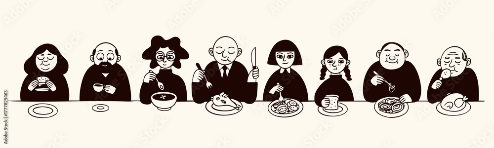 Various people enjoying dinner. Different delicious meal, dish, drink. Burger, coffee, soup, fish, pasta, toast, chicken. Hand drawn Vector illustration. Healthy diet, meal planning, calories concept #1777825463