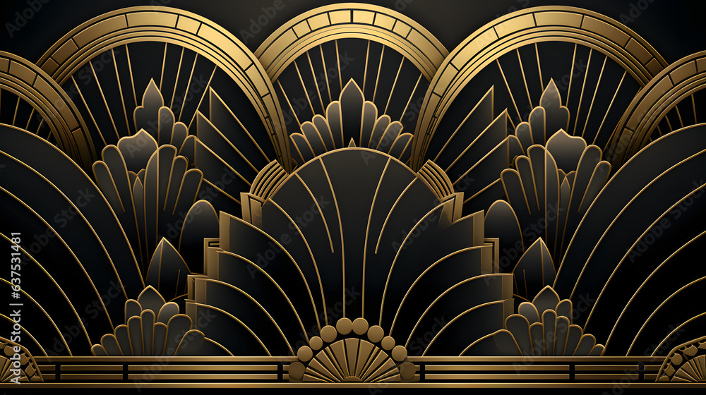 Vector abstract art deco luxury pattern, golden vintage artistic background with geometric shapes, archs and swirls. Linear retro ornament, gatsby card #637531481