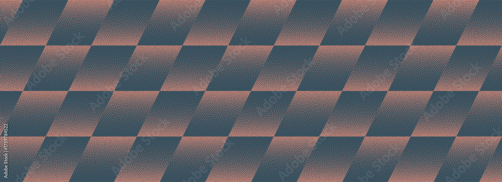 Vector abstract wide panoramic background with brown and blue halftone chevron lines in retro 1960s style. Grainy texture and angled flow create a bold graphical illusion for textiles design backdrop #1759784522