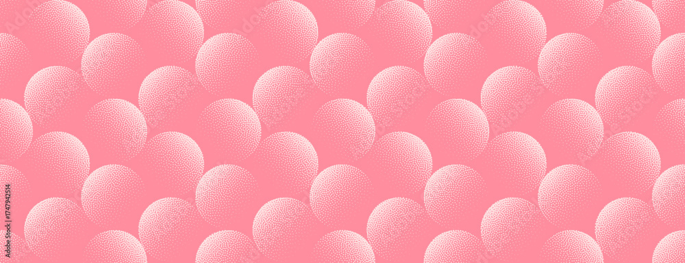 Vector abstract wide panoramic background with modern halftone sphere bubble pattern in pink colour. Grainy textured striking abstraction adds volume and softness for web, print and creative branding #1747942514