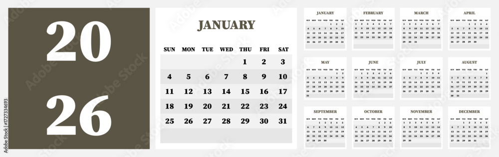 Vector calendar. Year 2026. Week starts on Sunday. Has 12 months. Calendar ready for printing. #1727334693