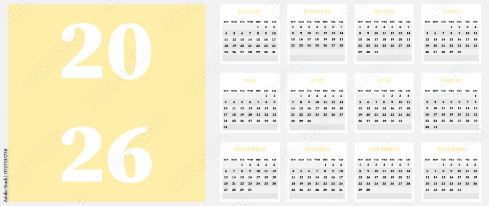 Vector calendar. Year 2026. Week starts on Sunday. Has 12 months. Calendar ready for printing. #1727334736