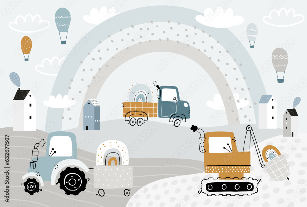 Vector children hand drawn cute construction cars, mountain landscape, balloons and clouds. Boho trendy design. Scandinavian. Illustration. Kids wallpaper design. Baby room design, wall decor, mural. #632677507