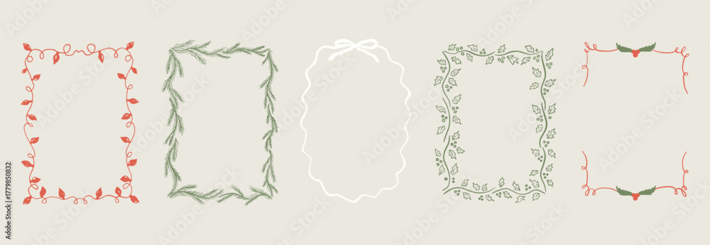 • #1779850832 Vector Christmas Collection of hand drawn vintage frames with wavy lines, bows and ribbons. Modern trendy borders for wedding invitation, birthday card, social media template. whimsical style.