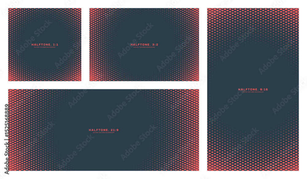 Vector eye-catching halftone pattern with rhombus grid and round center frame. Includes formats 1:1, 3:2, 21:9, 9:16. Perfect for UI, mobile apps, covers, modern design with a bold red-black gradient #1525168889