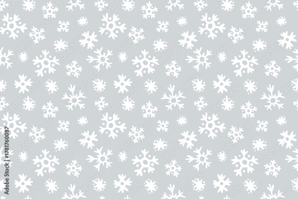 Vector hand drawn snowflakes pattern horizontal background. Christmas, new year, holidays white snow print on gray background. Winter silver texture for design, backdrop, decor, wrapping paper, cover. #1781760087