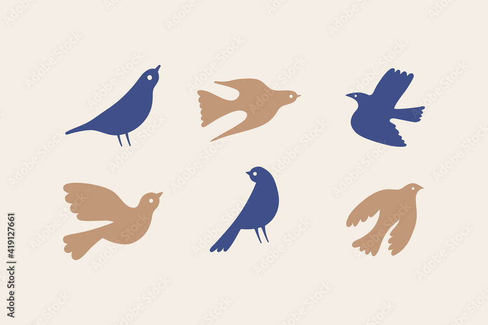 Vector illustration in simple hand drawn and linocut style - natural print, poster or logo design template - spring illustration - birds #419127661