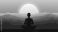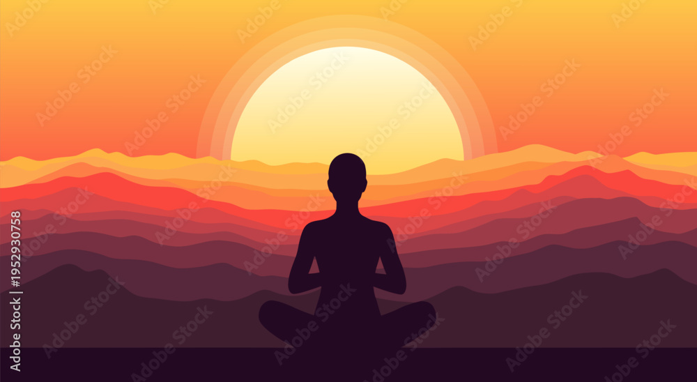 Vector illustration of a person meditating in a lotus pose against a vibrant sunset and mountain landscape #1952930758