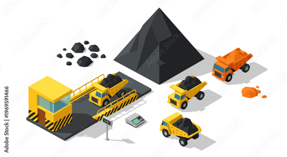 Vector illustration of industrial mining vehicles and black pyramid, infographic style presentation #1969591466