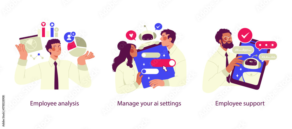 Vector illustrations representing AI in workplace: analyzing employee performance with data charts, managing AI settings with chatbots, and providing employee support through AI assistance. #1718328908