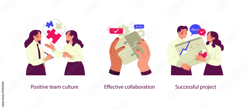Vector illustrations representing teamwork and productivity: two colleagues building a positive team culture, hands assembling puzzle pieces for effective collaboration, and coworkers celebrating a su #1718319561