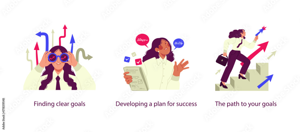 Vector illustrations showing business goal-setting: finding clear goals with binoculars, developing a plan for success with documents, and following the path to achieve goals symbolized by climbing st #1718319548