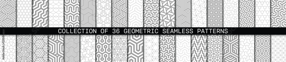 Vector set of 36 grey geometric linear patterns. Collection of seamless modern hexagonal textures for your design. #1205864221