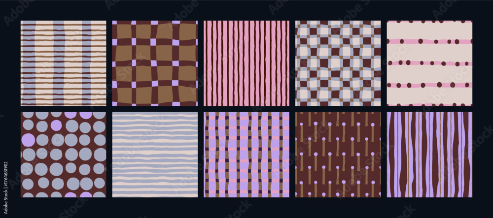 Vector set of seamless patterns. Modern backgrounds and textures for packaging, textile, wrapping paper. Multicolored checkered lines and confetti, polka dots, checkerboard, striped pattern. #1764681902