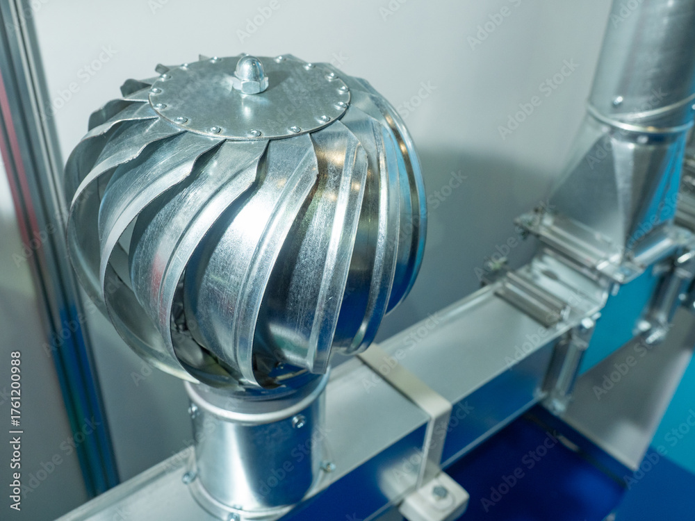 Ventilation and exhaust system. Turbo deflector on galvanized pipe. Ventilation shafts with pump for air supply. Steel turbo deflector for filtering oxygen. Ventilation duct with turbo deflector #1761200988