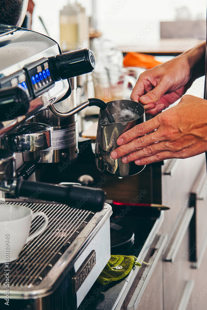 Vertical Horizon Close up hands coffee barista man make hot cup espresso shot from coffee machine. Vertical Cappuccino with milk italian cafe. Close up hands of barista make black hot coffee cup #1801189945