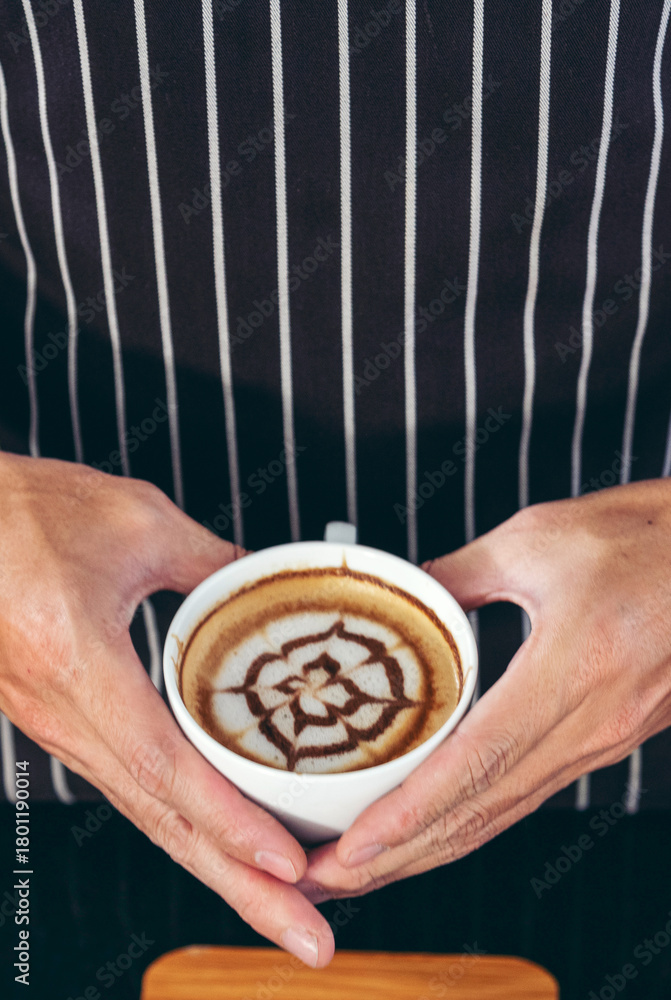 Vertical Horizon Close up hands coffee barista man make hot cup espresso shot from coffee machine. Vertical Cappuccino with milk italian cafe. Close up hands of barista make black hot coffee cup #1801190014