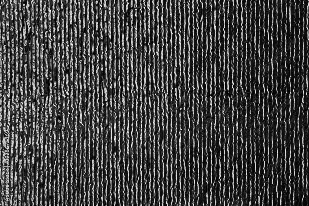 Vertical metallic foil texture with reflective crumpled ridges, ideal for abstract backgrounds, modern design projects, shiny surfaces, and creative visual effects. #1978673869