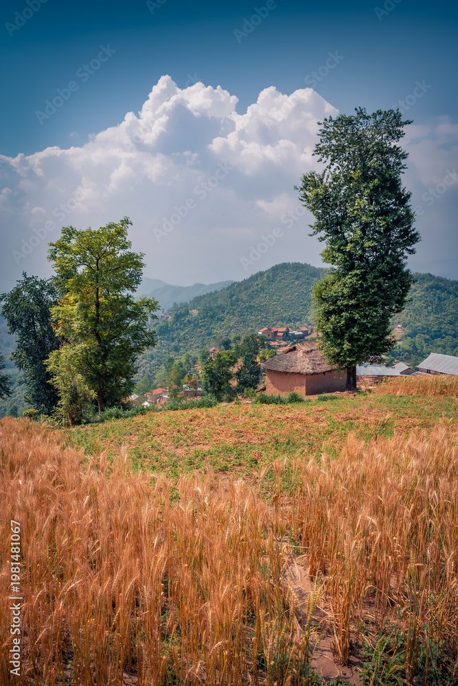 Vertical summer view of colorful Nepal’s village. Attractive morning field of wheat of in Nepal, Asia. Beauty of countryside concept background. #1981481067