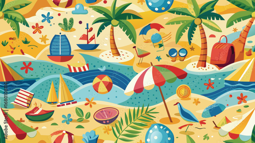 Vibrant cartoon beach scene with palm trees boats and beach umbrellas summer vacation #1680108114