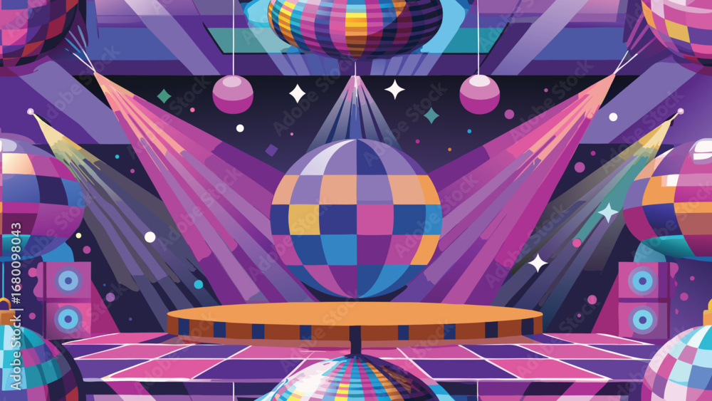 Vibrant disco ball and stage with colorful spotlights and speakers party dance floor #1680098043