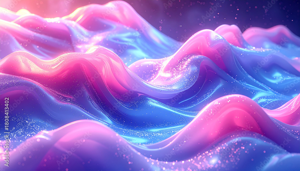 Vibrant fluid shimmering metallic curved wave on a moving colorful backdrop perfect for various design projects #1808413402
