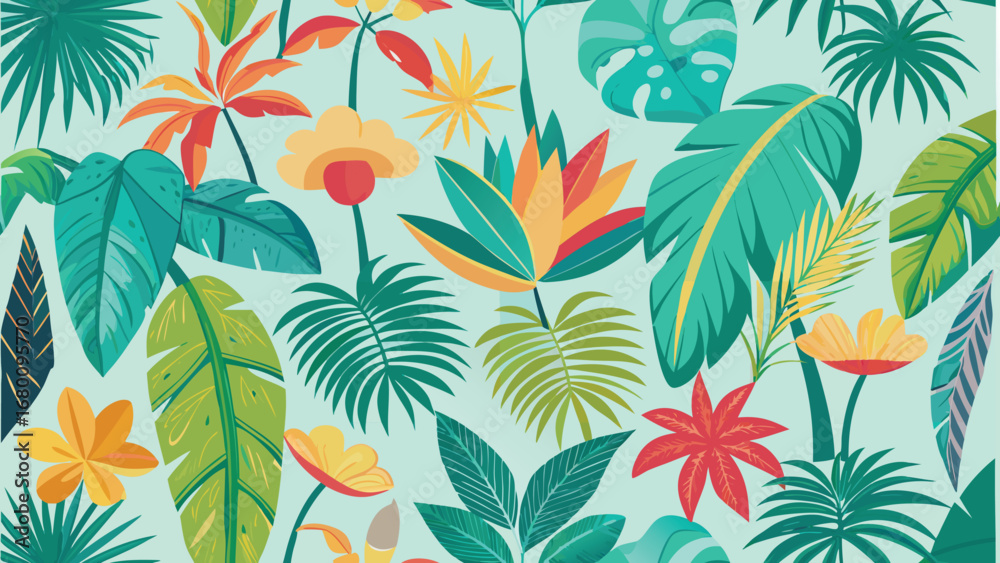 Vibrant tropical foliage pattern with palm leaves and exotic flowers vector #1680095770