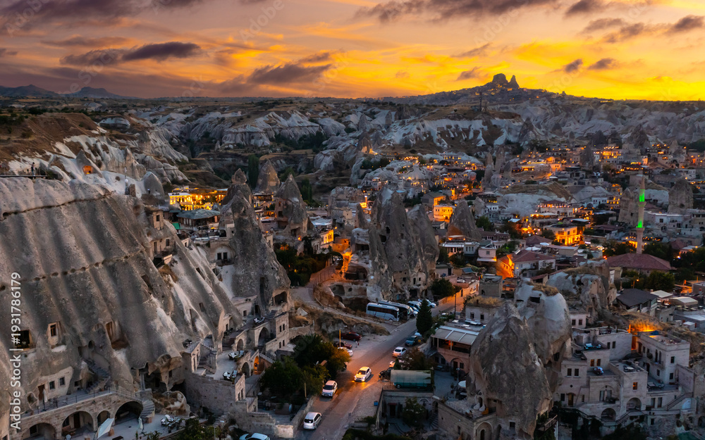 View of Goreme village with Uchisar castle in the background at sunset. Cappadocia. Nevsehir Province. Turkey #1931786179