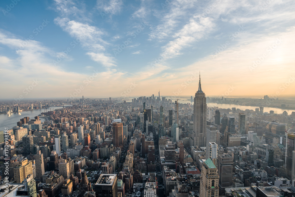 View of New York city during sunset golden hour with clouds and colourful sky #1712098181