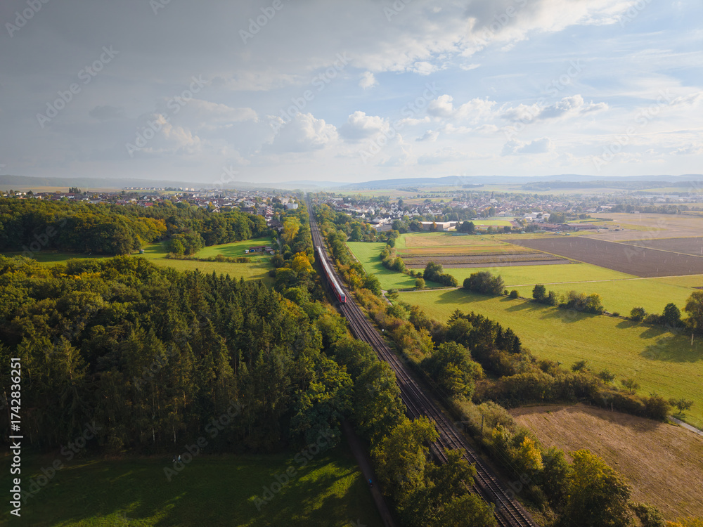 View of the train traveling through the fall landscape in changing weather conditions #1742836251