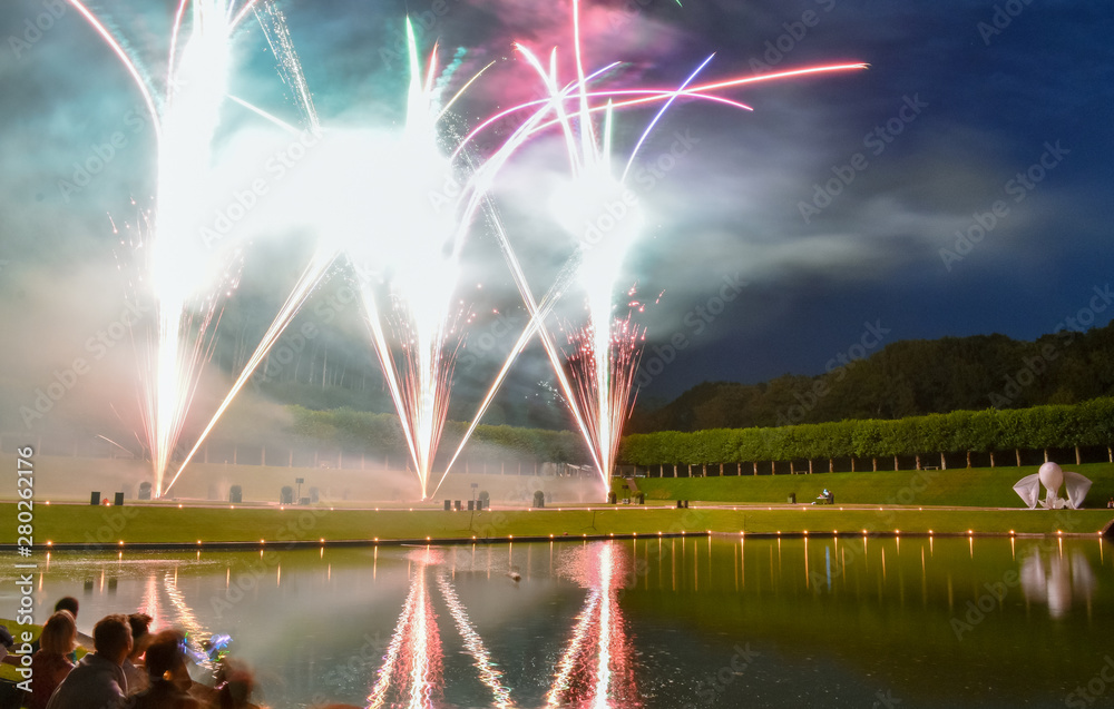 VILLANDRY CASTLE, FRANCE - JULY 07, 2017: The garden illuminated by 2,000 candles at dusk . Nights of a Thousand Lights at Villandry castle, France on July 07, 2017 #280262176