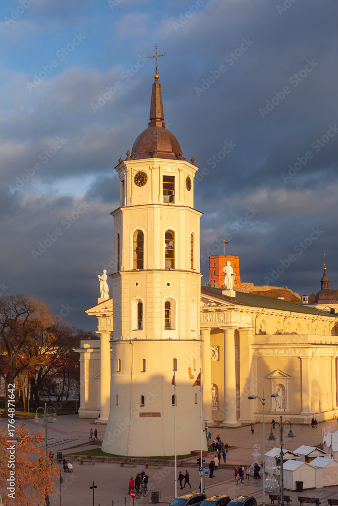 Vilnius Cathedral and Gediminas Tower in Vilnius Lithuania at sunset with stormy sky #1764871642