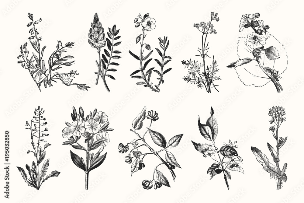 Vintage Flowers and Plants - Hand Engraved Vintage Botanical Line Artwork #195032850