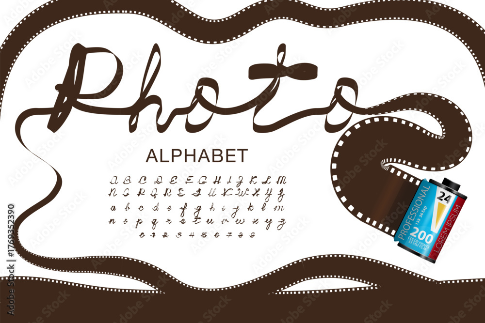 Vintage 35mm Film Tape Alphabet. Retro One-Line Font Created from Photo Cassette Film. Creative Typography with 60s 70s 80s Style Letters and Numbers for Nostalgic Graphic Design #1769352390