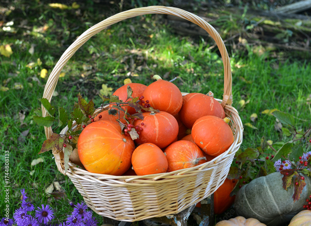 Vintage still life with pumpkins in the basket, flowers and decorations outside, thanksgiving day background, autumn calendar season concept #1744808133