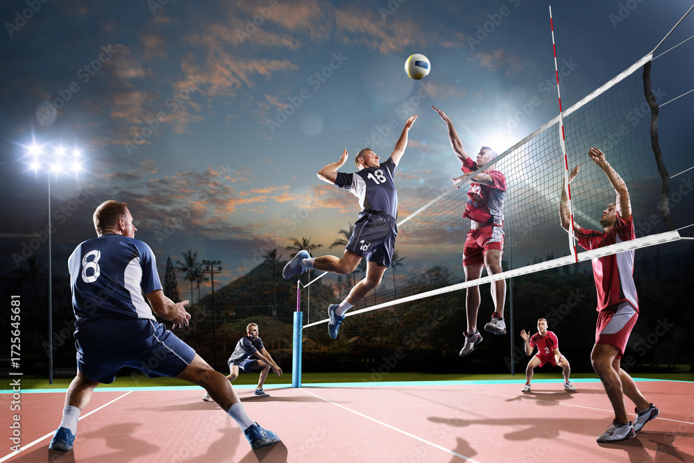 Volleyball. Professional volleyball players playing a match. Outdoor volleyball court. Volleyball players in action. A volleyball player kicks the ball. Volleyball tournament #1725645681