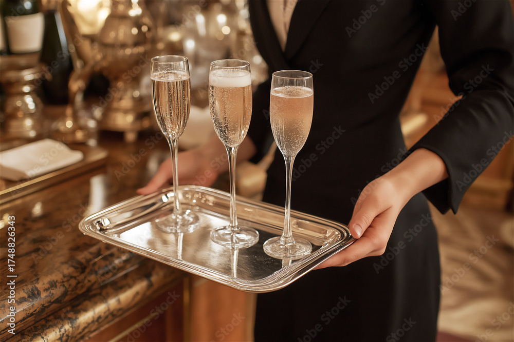 Waiter serving champagne glasses on silver tray in luxury restaurant or event. Professional hospitality service with elegant crystal flutes being presented at upscale celebration with formal attire. #1748826343