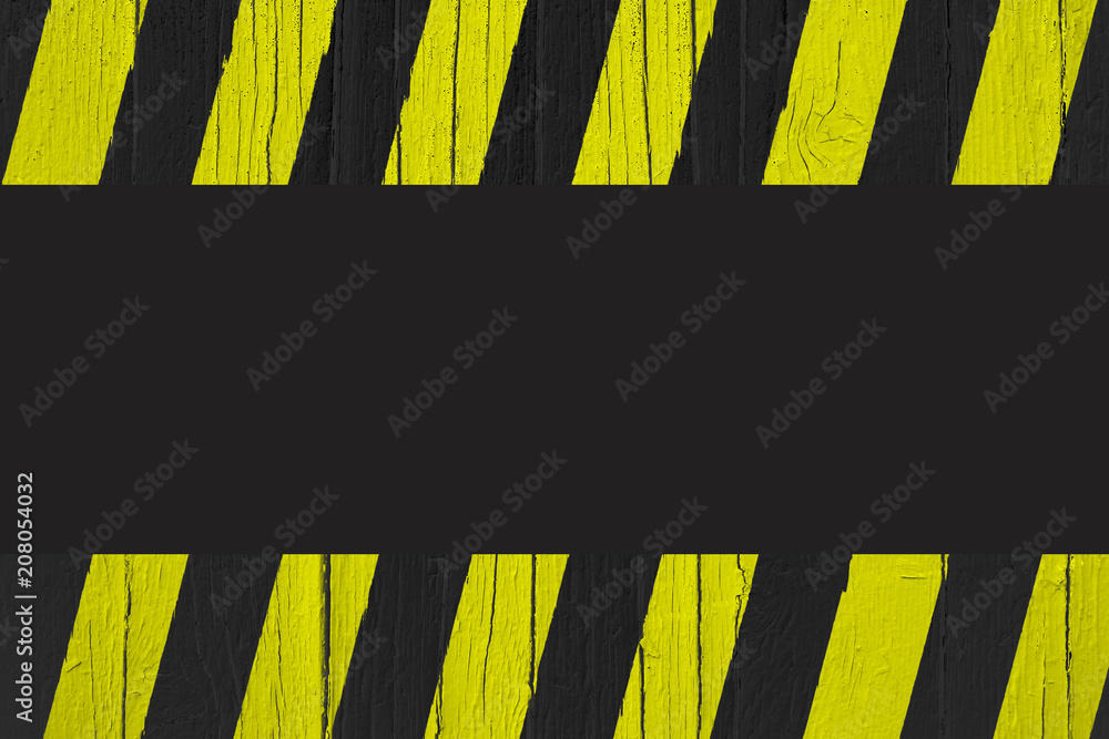 Warning sign with yellow and black stripes painted over cracked wood as border frame with black empty background space for text in the center of the frame. #208054032