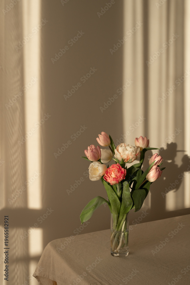 Wase with tulip flowers bouquet on table with neutral beige linen tablecloth and empty wall background with abstract natural warm evening sunlight shadows, floral home interior decor #1965582921