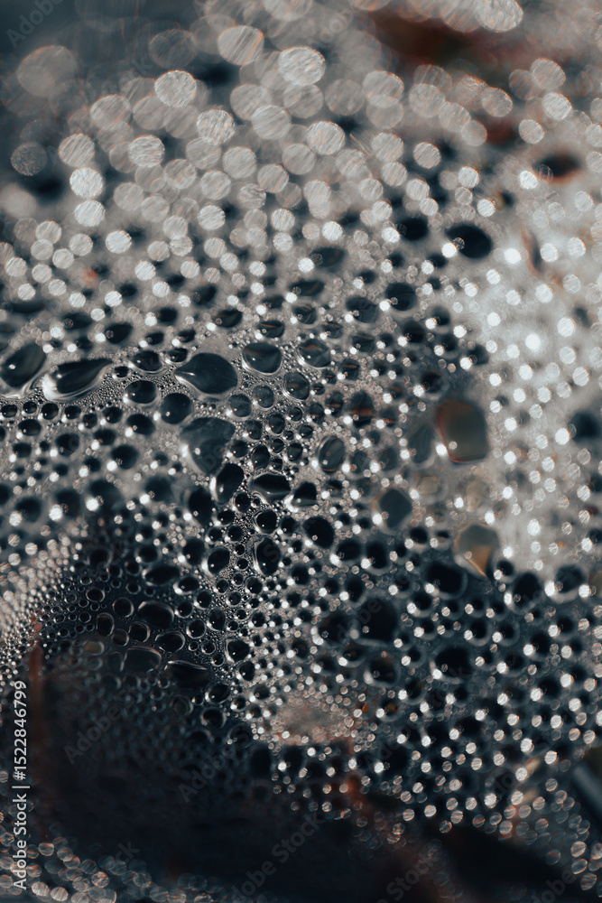 Water droplets gather on a surface covered in fine textures, glistening in soft light after recent rain. Small plants are visible in the background, enhancing the natural ambiance. #1522846799