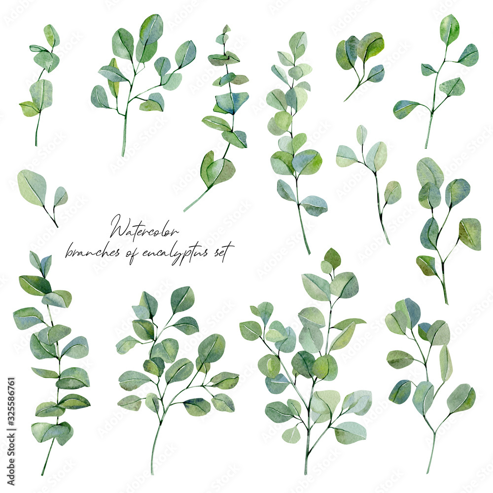 Watercolor eucalyptus leaves and branches set. Floral eco illustration for design and textile fabric Hand drawn silver dollar eucalyptus elements for baby shower, wedding insparation. #325586761