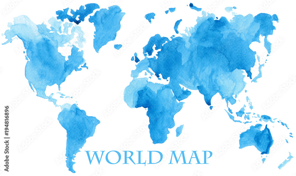 Watercolor illustration of world global map painted in blue ink color splash isolated on white background #194816896