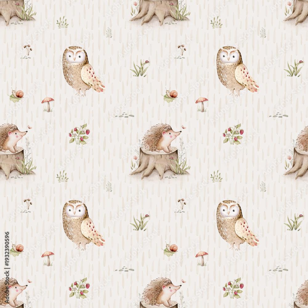 Watercolor seamless pattern of cute owl and baby hedgehog animal. Woodland nursery background for children wallpaper, textile and fabric pattern. watercolour forest drawing #1932390596
