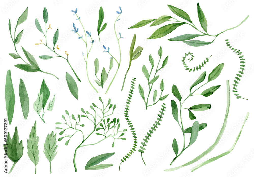 Watercolor spring leaves, branches and herbs. Hand painted botaical plants aand grass set isolated on a white background. Floral greenery illustration for wedding invitation, design, print, logo #509127291
