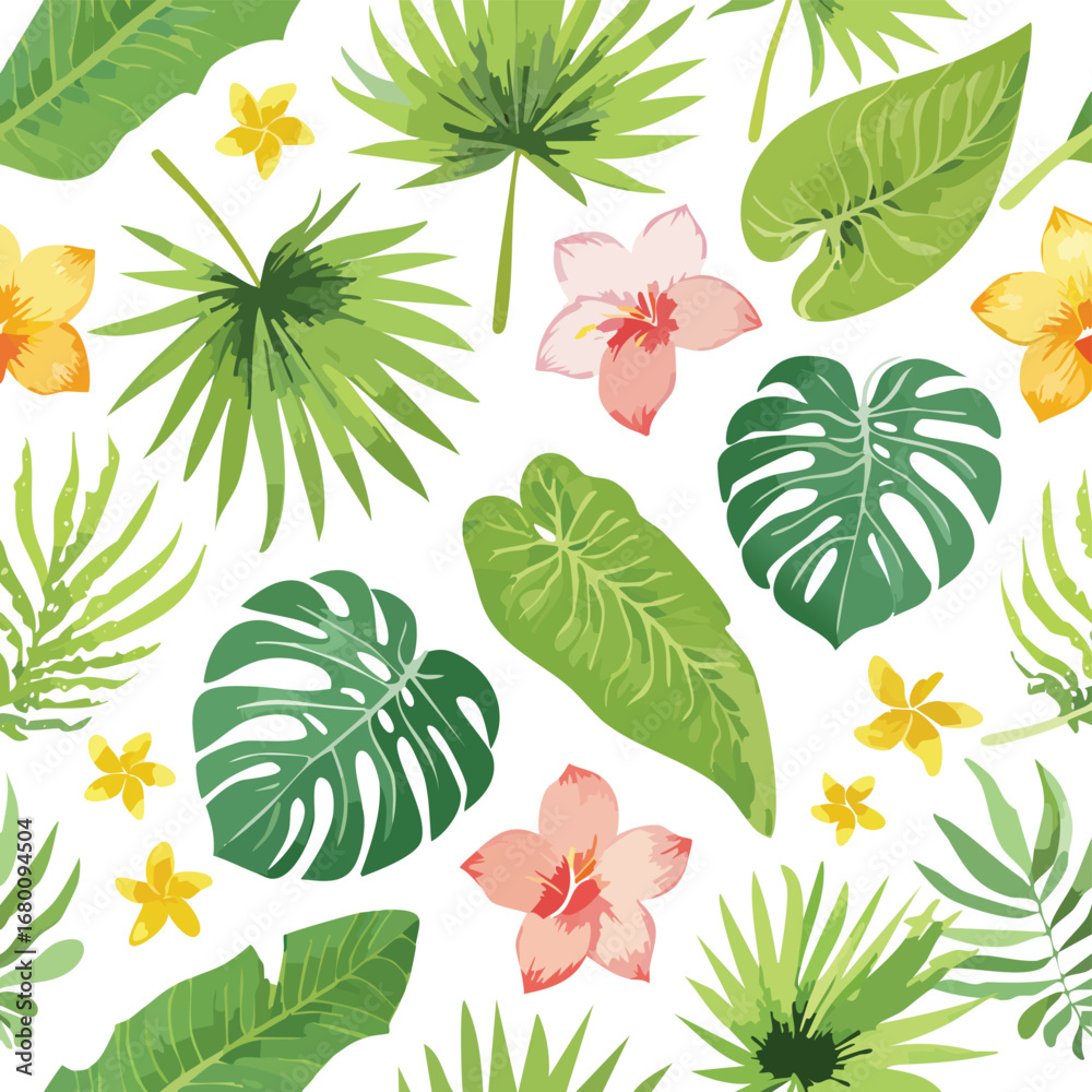 Watercolor tropical leaves and flowers seamless pattern on white background floral #1680094504
