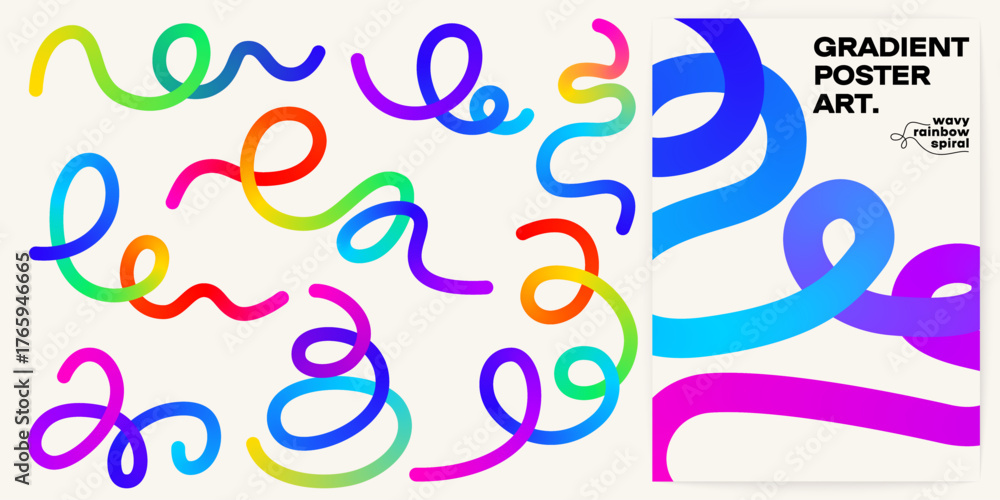 Wavy color line shapes. Abstract gradient fluid curve and spiral dynamic figures, geometric bright wave twist elements for modern background pattern design. Vector set #1765946665