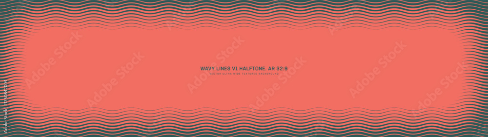 Wavy lines halftone pattern vignette frame ultra wide 32:9 aspect ratio red green vector classy abstract background. Striped rippled structure half tone ultrawide format guilloche style rounded border #1750642004