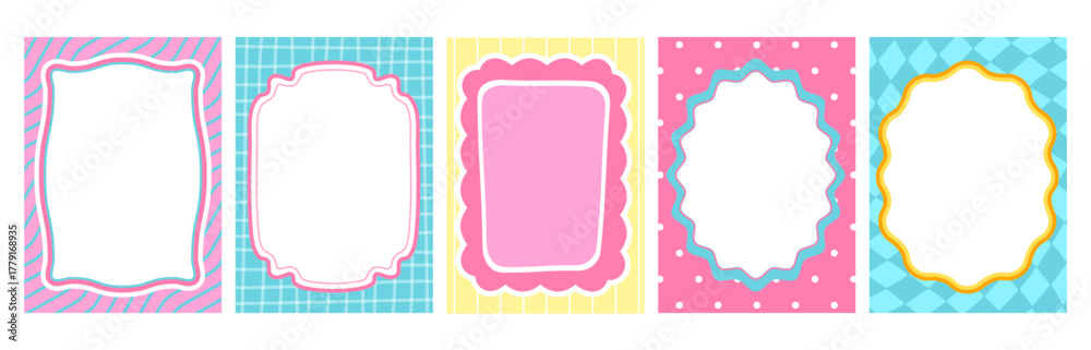 Wavy scallop frames set isolated on white background. Vector cartoon illustration of bright color borders with abstract dot, line, checkered patterns, oval and rectangle templates for cute kid posters #1779168935