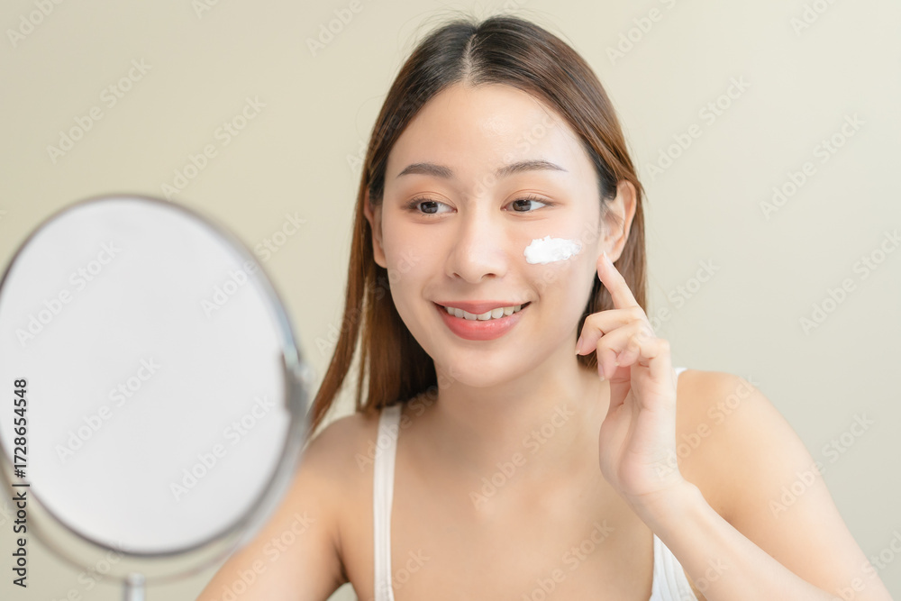 wellness care concept, young woman looking at the mirror and applying facial skin care cream on her face #1728654548
